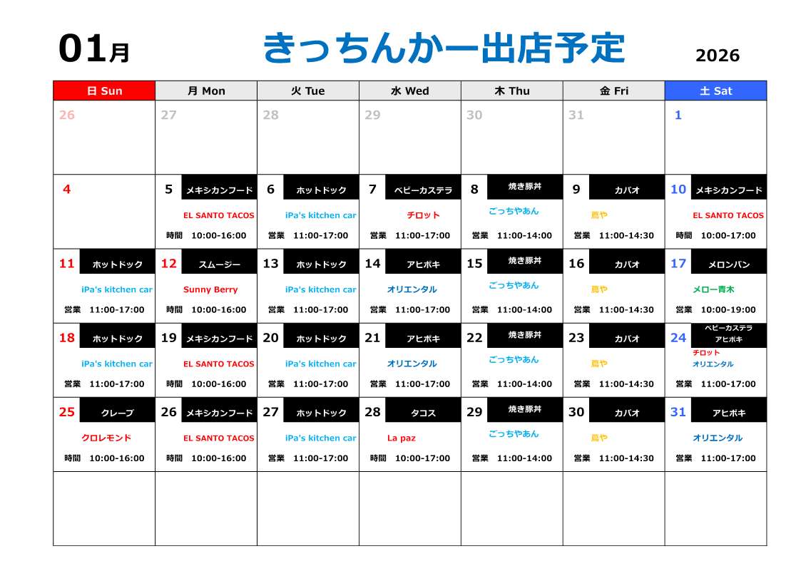 1月のキッチンカー出店予定表がついに完成しました! 今月はなんと…✨新しい仲間がドドンと参戦✨ ラインアップがさらにカラフル&パワフルにパワーアップしています。